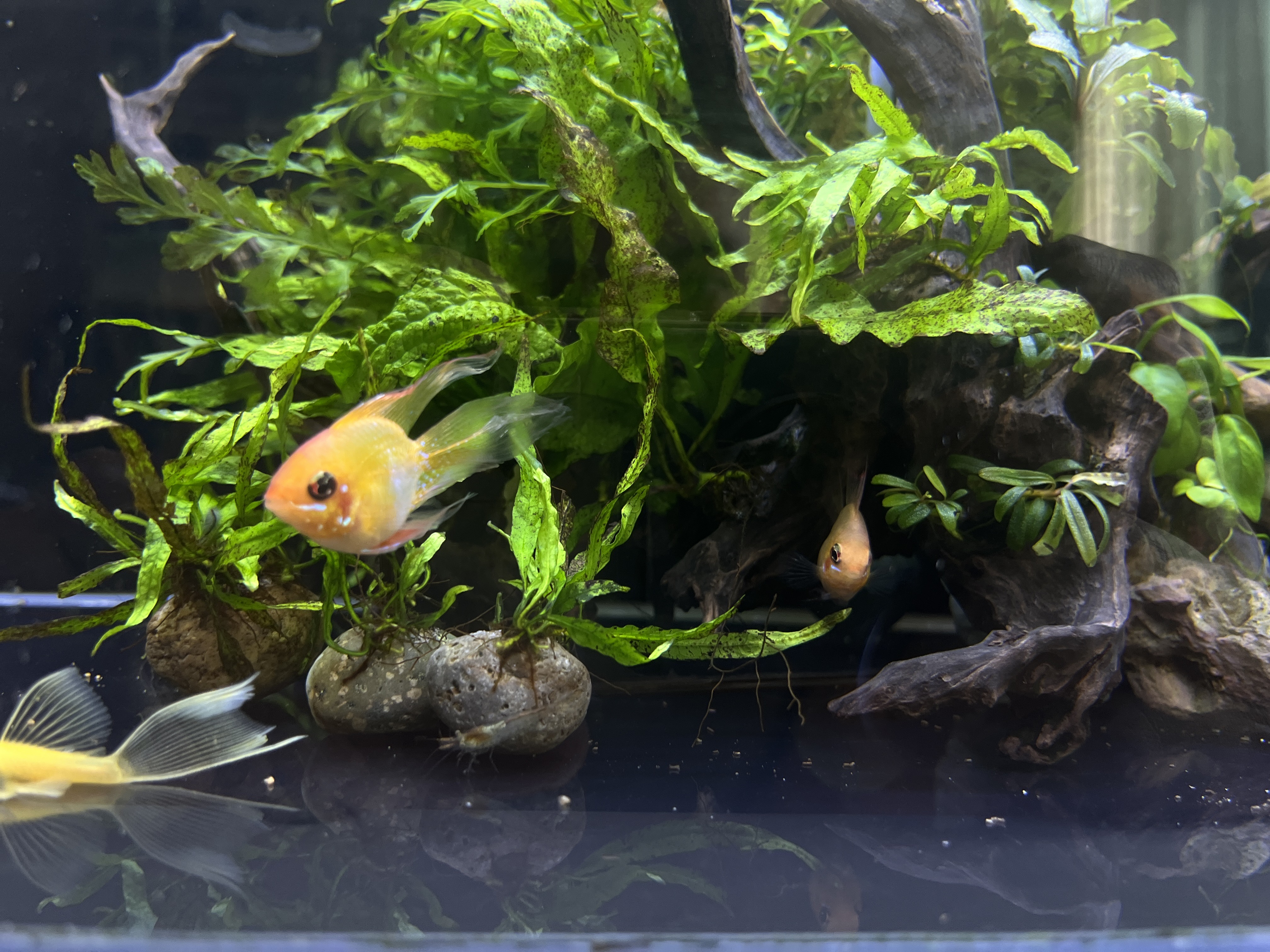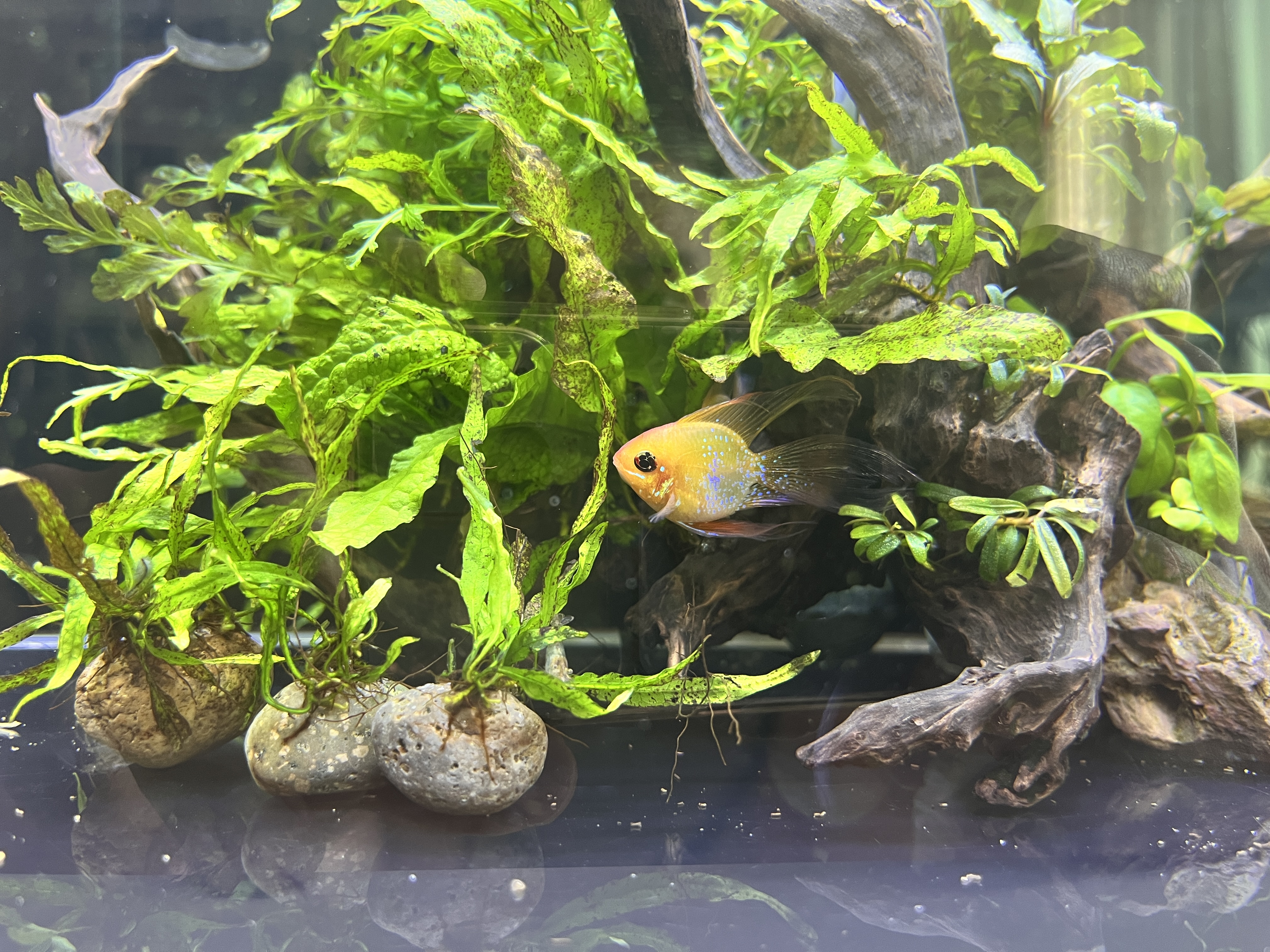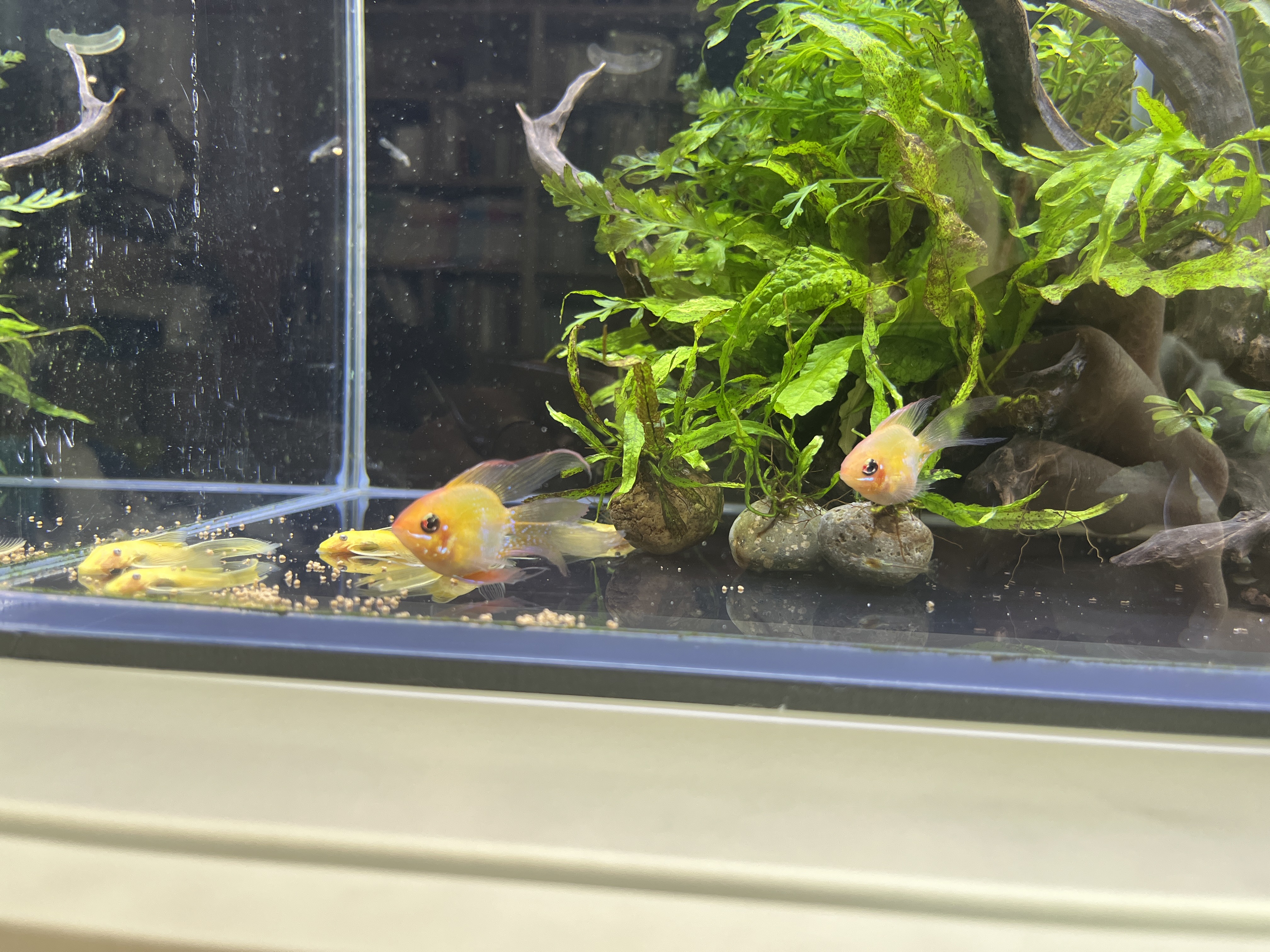 노란 물병아리 같은 똥글똥글한 귀여움과 푸르게 반짝이는 바디, 거기에 붉은 발색과 하늘거리는 롱핀이라면, 아마 처음보는 순간 반하실 꺼에요 ㅠㅠ, 그런데 이게 전부가 아닙니다. 정말 여러가지 성격을 가진 아이들이 많지만 특히 시클리드 종의 특성 상, 1:1 쌍을 잡고(결혼을 하고) 치어를 돌보는 신기하고 감격스러운 광경을 볼 수 있죠.